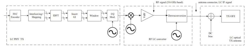 At the receiver, the optical front end converts incoming light variations into an electrical signal, which is conditioned and down-converted to baseband. Multicarrier demodulation, symbol de-mapping, and error-correction decoding are applied to reliably recover the transmitted data. The architecture is optimized for secure, high-throughput optical wireless communication aligned with IEEE 802.11bb principles